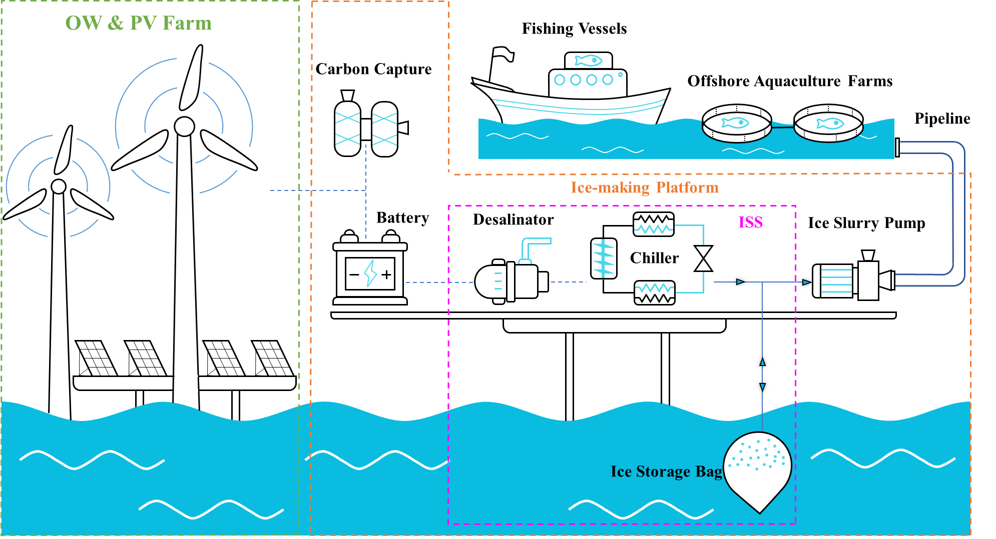 在国家重点研发计划等项目资助下,研究团队设计了一套集海水冰浆制备、电池储能与碳捕集于一体的P2I系统,可将海上风电与光伏产生的绿色电能就地用于海水制冰,转化为可泵送、可储存的流态化冰浆,以冷能形式存储于作业平台或水下柔性囊式冰袋中,服务于海上渔业冷链物流。