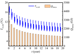 图1岩土储能原理及20年供暖期出口水温和供热量预测