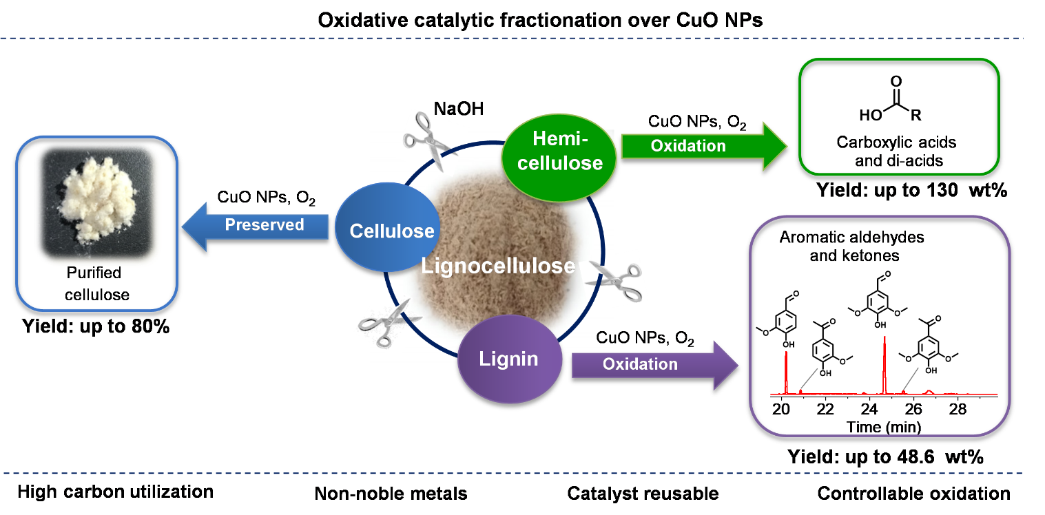 近期,广州能源研究所生物质催化转化研究室王晨光研究员与比利时鲁汶大学Bert F. Sels教授合作,在生物质全组分高值化利用方面取得重要进展。5月30日,相关研究以Oxidative Catalytic Fractionation of Lignocellulose to High-Yield Aromatic Aldehyde Monomers and Pure Cellulose为题以长文(Research Article)形式在线发表于《ACS-催化》(ACS Catalysis)。 温和氧化是一项具有应用前景的生物质催化转化技术,可将木质纤维素类生物质转化为高价值的化学品和纤维素。然而在此过程中,碳水化合物的溶解和转化以及木质素和单酚类物质的缩聚和降解限制了整体碳效率的提高。 该研究针对上述技术瓶颈,借鉴传统氧碱法造纸除木质素工艺,基于木质素优先利用思路提出催化氧化分离策略并应用于木质纤维素组分分离,同时将木质素氧化转化为高附加值单酚。研究发现,温和条件下成本较低的纳米氧化铜颗粒(CuO NPs)表现出优异的催化氧化分离性能,在将木质素催化氧化为芳香醛酮的同时抑制了纤维素水解,该方法取得的高附加值单体和材料(纤维素)的碳效率达80%(图1)。其中,木质素被转化为芳香单体(主要为香兰素和丁香醛),转化率高达48.6 wt %。顺利获得“分离-氧化”两步实验和模型反应发现,CuO NPs能高效催化木质素苯丙烷侧链C-C键和C-O键断裂,促进木质素氧化中间体亚甲基醌自由基向目标产物芳香醛酮的转化,使单酚收率超过理论值(基于β-O-4键的含量);半纤维素则选择性转化为草酸为主的水溶性小分子脂肪酸;80%的纤维素以白色固体残渣(纤维素纯度高达95%)形式保留。顺利获得模型物反应及13C NMR等表征手段证明,铜阳离子与纤维素的葡萄糖链上的羟基及吡喃环的氧原子的强烈络合作用是抑制纤维素水解的主要原因(图2)。 该论文中提出的催化氧化分离策略普遍适用于木本和草本生物质的催化转化,为今后生物质温和全组分高值化利用给予了指导思路,进一步促进从化石经济向利用生物质生产化学品的更可持续的生物经济的过渡。 该研究取得国家重点研发计划项目、国家青年自然科学基金项目和广东省重点领域研发计划项目的资助。原文链接:http://pubs.acs.org/doi/full/10.1021/acscatal.3c01309