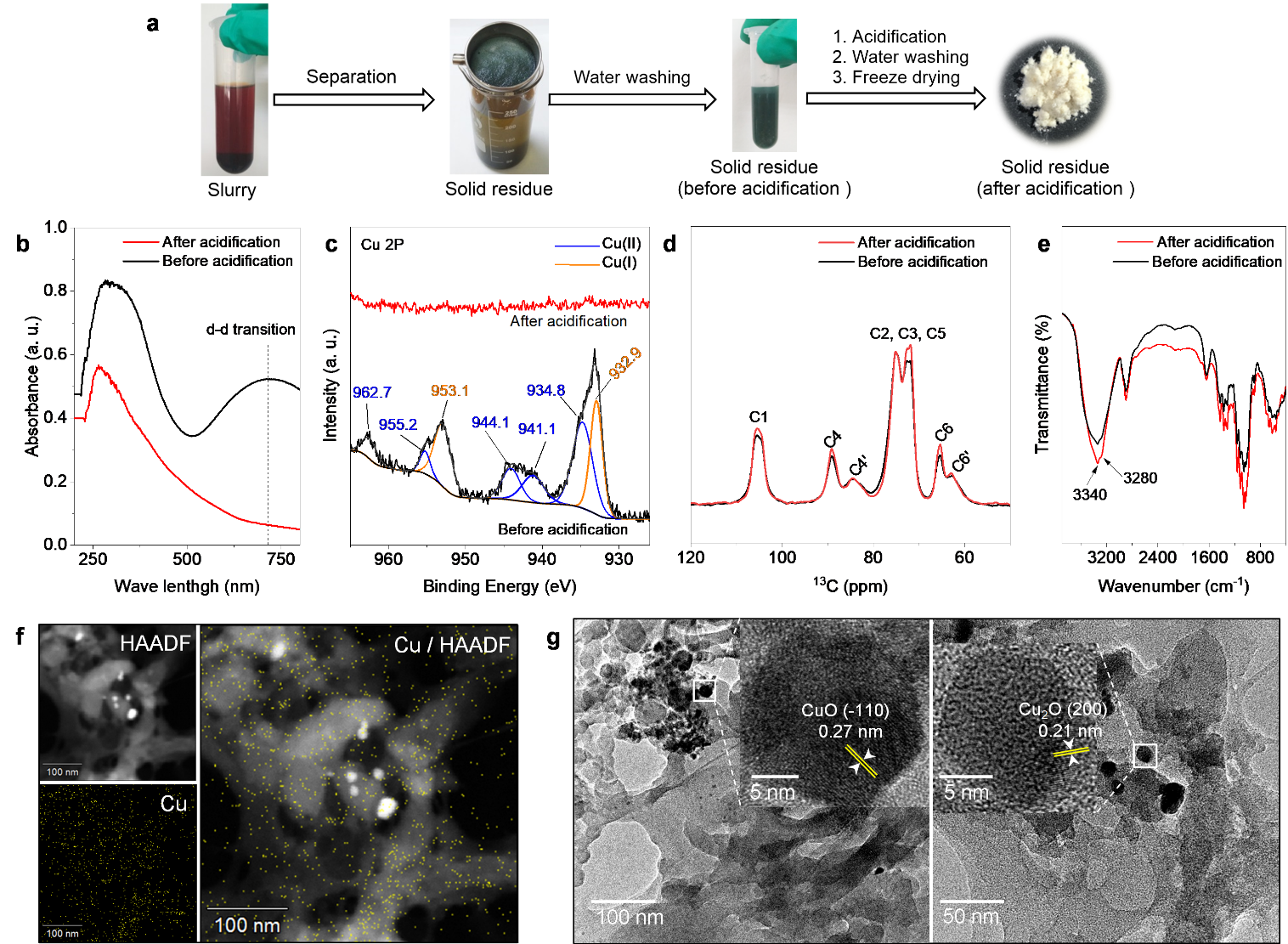 图2. (a) 固体残渣分离流程图。(b) UV-vis-NIR DSR光谱,(c)Cu 2p XPS核级谱,(d)固态13C NMR谱图和(e)FT-IR spectra of SRs。(f)酸化前固体残渣的EDX mapping和(g)TEM图.