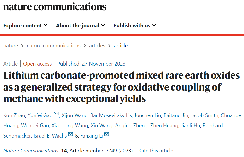近期,广州能源研究所废弃物处理与资源化利用研究室赵坤副研究员联合美国北卡罗莱纳州立大学等研究团队,报道了一种在以促进剂碳酸锂(Li2CO3)修饰的具有氧化还原活性的复合稀土金属氧化物的催化作用下,实现低温高效化学链甲烷氧化偶联的方法。该催化剂在700 下单程C2+收率高达30.6%,且在甲烷分压高达1.4 atm的条件下仍能表现出稳定的性能。相关研究成果以Lithium carbonate-promoted mixed rare earth oxides as a generalized strategy for oxidative coupling of methane with exceptional yields为题,于近期发表在《自然—通讯》(Nature Communications)。