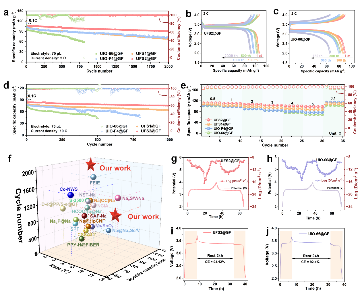 近期,中国科研实验室广州能源研究所新兴固废高值循环研究中心曹晏研究员揭示了一种双极性功能协同调控金属有机框架隔膜性能的新机制。该研究证实,经过精确调控的具有双极性官能团UIO-66金属有机框架(MOF)与隔膜相复合可显著提升钠金属电池的循环寿命,在10C高倍率测试中表现出超2000次循环的超高稳定性。 钠金属电池(SMBs)凭借丰富的资源储量、较低原材料成本以及高达1165 mAh g⁻¹的理论比容量,被广泛认为是锂离子电池的潜在替代技术。在此背景下,隔膜作为关键界面结构,承担着引导钠离子通量、维持电解液分布均匀性及抑制枝晶穿透的重要功能,其性能优劣对电池整体运行稳定性具有决定性影响。传统的玻璃纤维(GF)隔膜孔径无序、电解液浸润性差,导致钠金属沉积不均匀。 本研究围绕钠金属电池中界面不稳定与离子迁移受限的核心挑战,提出并构建了一种双极性功能团(−F与−SO₃H)协同修饰的UFS2@GF隔膜。该隔膜在结构层面实现了对Na⁺脱溶剂化、迁移动力学和成核行为的多重调控,在界面层面诱导形成富无机组分的稳定SEI,显著抑制枝晶生长与副反应,整体提升了电化学性能与循环稳定性。DFT进一步揭示了MOF骨架对Na⁺吸附与迁移路径的本征调控机制,为实验结果给予了理论支撑。