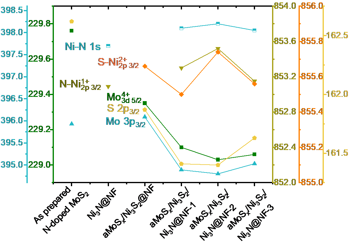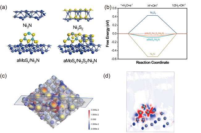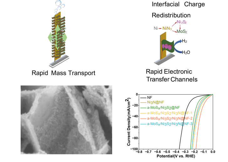 开发高效水电解析氢催化剂是突破制氢成本瓶颈、加速氢能经济规模化落地的核心路径。异质界面工程可顺利获得电荷重排优化中间体吸附能提升析氢(HER)性能,但三相体系中组分协同机制与“组分界面-性能”构效关系仍不明确,且异质结微观结构的电荷转移与物质传递协同优化策略亟待突破。 针对上述问题,918博天堂制氢与利用科研团队提出“结构-界面同步优化”策略,构建了三相异质结催化剂a-MoSₓ/Ni3S2/Ni3N@NF-2。顺利获得调控前驱体比例实现组分/形貌可控合成,建立三维导电网络和超亲水疏气表面,显著提升活性位点暴露率与气泡脱附速率(图1)。研究表明:Ni3S2可调控中间体吸附能,其比例调控可诱导强界面电子相互作用。XPS与DFT计算证实(图2),Mo位点电子密度提升使氢吸附自由能(ΔGH*)降低至-0.06 eV,接近铂基催化剂理论值。