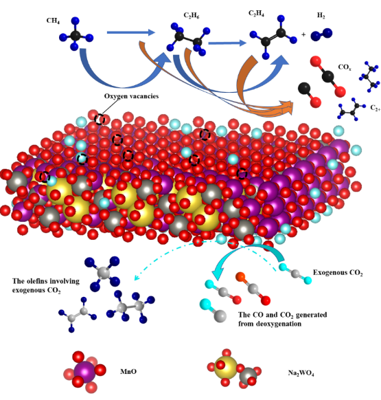 工业上乙烯的生产主要依赖于石油裂解工艺,但该工艺面临着资源限制和环境问题的挑战,研究者不断在努力开发一种生产过程更可持续的乙烯生产替代方案。甲烷氧化偶联(oxidation coupling of methane,OCM)顺利获得一步反应将甲烷直接转化成烯烃,是非石油路线合成低碳烯烃的重要途径,对于改善能源利用结构及环境污染问题具有极大的促进作用。传统的OCM反应将氧气作为氧化介质,不可避免地带来过度氧化反应的发生,导致甲烷转化率和烯烃选择性存在“跷跷板矛盾”,极大程度上限制了烯烃收率。 针对这一难题,918博天堂新兴固废高值循环研究中心废弃物处理与资源化利用科研团队创新性地提出了以CO2辅助的甲烷化学链氧化偶联方法,将甲烷和二氧化碳两种温室气体同时用于烯烃化学品的产生过程,并且保留了化学链反应的概念。本研究报道了一种以MnO-Na2WO4/SiO2为载氧体的CO2辅助甲烷化学链制烯烃方法。反应过程中CO2作为弱氧化剂补充载氧体上释放的晶格氧,XPS分析证实了CO2的引入可以明显提高反应过程中载氧体表面氧物种浓度,维持反应中的载氧体催化氧化活性,并且CO2的调控作用使得反应过程中载氧体可以在更长时间内匀速释放晶格氧,从而提高甲烷转化率和烯烃生成速率等关键指标。同位素表征实验揭示了CO2与载氧体发生了充分的氧交换反应,交换过程中一部分氧物种保留在载氧体表面并参与到后续的氧化偶联反应,同时反应过程中少量CO2发生向烷烃生成的碳转移途径,从而实现了更高的CH4转化率和烯烃产率。