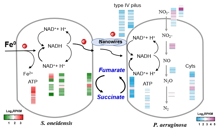 研究图文摘要 低碳氮比废水由于缺乏电子供体难以实现氮去除。而以零价铁作为电子供体可以实现脱氮,且该过程具有安全性高、成本低廉等优势。由于反硝化菌的代谢多样性,微生物铁氧化的作用始终是黑箱般的存在,现在受限于模式菌株的缺乏和获取胞外电子机理未知。针对上述问题,研究团队构建了电活性菌Shewanella oneidensis和反硝化菌Pseudomonas aeruginosa共培养体系,以零价铁作为唯一电子供体,硝酸盐作为唯一电子受体,探究了“嗜铁”反硝化可行性及其反应机理。研究发现S. oneidensis菌可作为生物引擎,收集并释放铁腐蚀产生的电子,用于P. aeruginosa菌脱氮过程。宏转录组学分析手段显示,微生物电共生过程调控编码反硝化酶、胞内电子转移蛋白以及群体感应的基因表达,对微生物脱氮具有重要作用。
