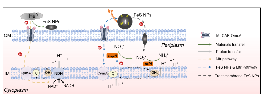 系统功能基因表达示意图 在进一步在可见光调控下(λ=395 nm),该体系实现了硝酸盐的反硝化与异化还原为铵的双路径协同。研究发现在光照下顺利获得S. oneidensis菌自组装形成的FeS纳米颗粒介导微生物电子跨膜传递,从而提升电子利用效率。该体系实现了平均63.8 mg N/d/L的硝酸盐去除率,以及27.1%的铵氮回收效率。更重要的是,该系统还成功与实际污水活性污泥耦合,在模拟废水中表现出优异的脱氮(233.3 mg N/d/L),显示出较强的工程应用潜力。